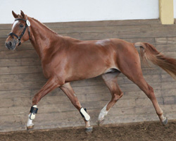 Ein züchterisch höchst interessantes Pferd landete mit Wertnote 7,82 auf dem 4. Platz: Der vierjährige Mecklenburger Wallach SAN DIEGO ist eine Sohn des Sancisco aus der bekannten S-Dressurstute Jana v. Janos. Sowohl Jana als auch deren Mutter Adra I v. Adriano hat Ronald Lüders einst bis zur schweren Klasse geritten. Das Springen zählt zwar nicht zu den Stärken, aber die drei hervorragenden Grundgangarten, die wie beim Sieger DO IT ein Mittel von 7,96 erreichten, lassen für den mit viel weißer Farbe ausgestatteten Fuchswallach eine Karriere im großen Viereck vermuten. Zumal auch die Rittigkeit mit 8,25 als deutlich gut anzusprechen ist. (Franz Wego)