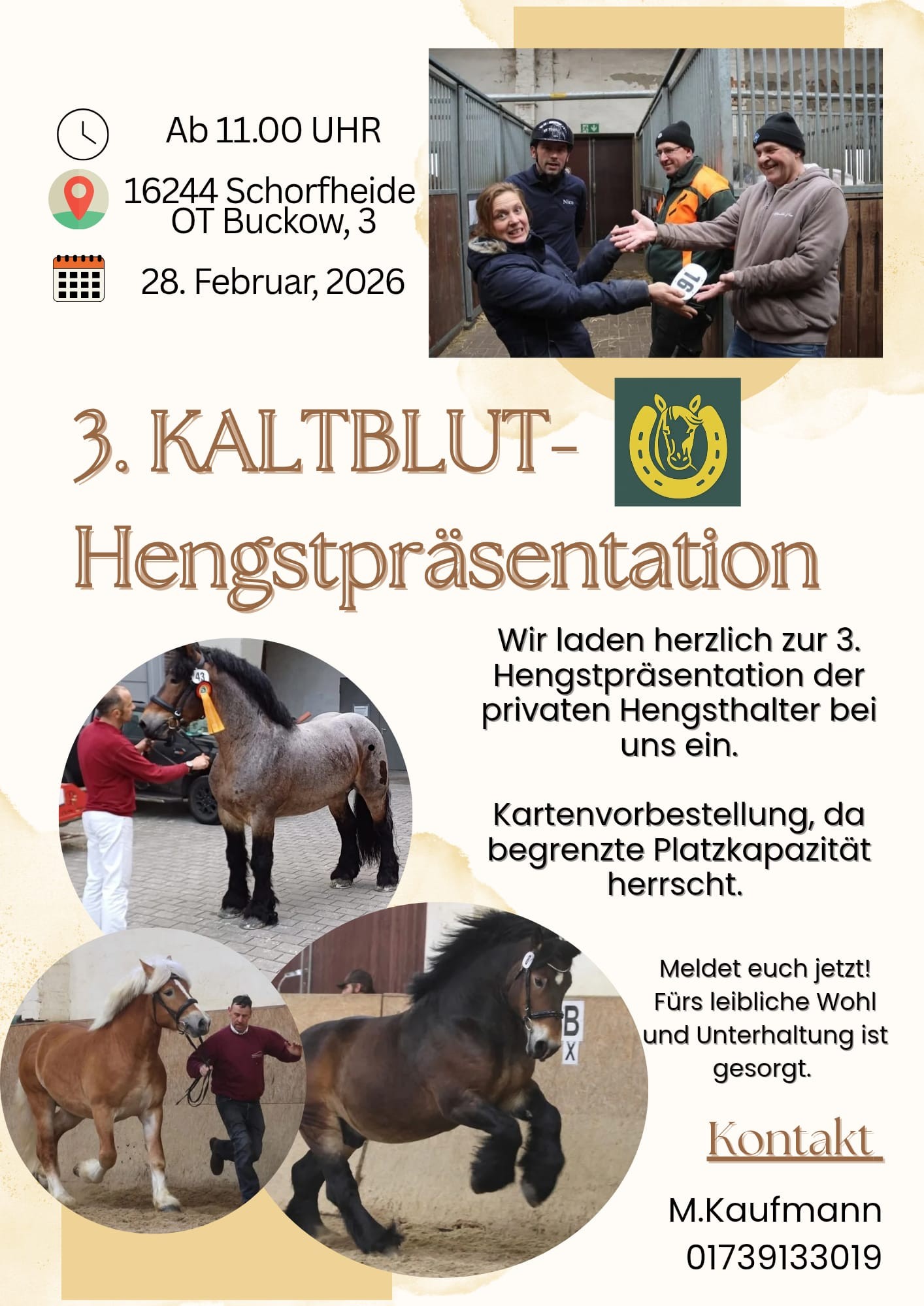 Am 28. Februar um 11 Uhr im Ortsteil Buckow 3 von 16244 Schorfheide (Brandenburg). Es besteht eine begrenzte Kapazität an Plätzen in der Halle.