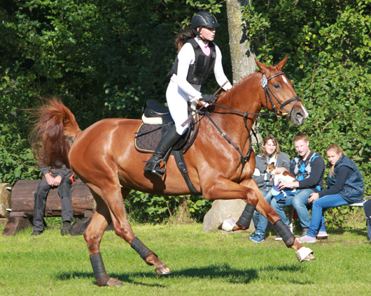 Über zwei Springchampion durfte sich der Trakehnerhof Kiewald selbst freuen, darunter der sechsjährige Hobbit v. Heops x Altan II (hier im Gelände von Valluhn unter Tessa Fischer). Foto: Jutta Wego