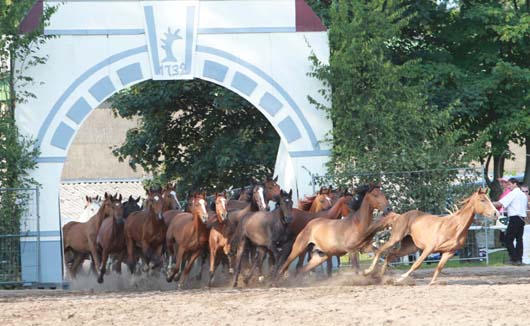 Wenn die freilaufende Herde durch das stilisierte Tor auf den Hauptplatz galoppiert, ein Nachbau aus dem ehemaligen Hauptgestüt in Trakehnen, weiß der geneigte Besucher, dass das Ende der Parade naht.