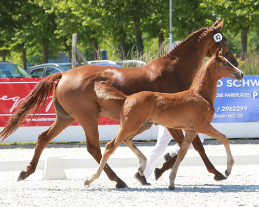 Die Siegerstute bei den dressurbetont gezogenen Fohlen wurde, wie schon mehrfach in den zurückliegenden Jahren, von Ulrike Anders aus Loitz ausgestellt. Mit ihrer Staatsprämienstute Serafina von Stedinger/D‘Olympic hat sie diesmal ein Fohlen von Fürst Wilhelm gezogen das 82,5 Punkte erhielt was einer Durchschnittsnote von 9,16 entspricht. Typ Bewegung und Exterieur passten alles gut zusammen und der Sieg war unumstritten. Es gab je viermal die 9,5 und 9,0 und eine 8,5.