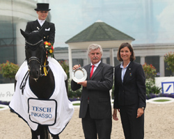 Der dritte Platz im Preis der TESCHINKASSO ging an die Österreicherin Victoria Max-Theurer auf dem gekörten Hengst Augustin. Der Oldenburg-Sohn ihres ehemaligen Europameisterschaftspferdes August der Starke erzielte 77.894 Prozent. "Sehr glücklich", zeigte sich Anabel Balkenhol nach ihrem mit 75,426 Prozent bewerteten Ritt auf Dablino. "Nach seiner langen Pause ist Aachen erst das dritte Turnier und nun kann ich endlich sagen: Jetzt ist er wieder in seiner alten Form, ich komme zum Reiten, er ist gut drauf, er will und das ist ein schönes Gefühl", so Balkenhol, die auf den vierten Platz kam. Die Tochter des ehemaligen deutschen Bundestrainers Klaus Balkenhol ging als zweiter deutscher Starter in den Grand Prix um den Lambertz Nationenpreis. "Im Olympiajahr geht man hier schon anders an den Start. Man muss gute Leistungen bringen, man darf keine Fehler machen und wir haben super Paare mit einer hohen Leistungsdichte. Ich möchte gerne mit nach London und ich schätze meine Chancen gut ein, wenn sich Dablino auch in den nächsten Prüfungen hier so gut zeigt." Nach zwei unglücklich verlaufenen CHIO-Jahren für sie - einmal erwischte Anabel Balkenhol das Noro-Virus, einmal ging Dablino lahm - ist sie jetzt optimistisch gestimmt. "Ich habe viel unternommen, um hier fit zu sein, auch autogenes Training und Mentaltraining zählten zu meinem Vorbereitungsprogramm." Dablino, zwölfjähriger Hannoveraner De Niro-Wanderbursch-Sohn, zählte mir ihr schon zum deutschen Team auf den Weltreiterspielen in Kentucky 2010.