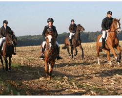 Blickweite. Von dort aus ging es Richtung "Sandberg" über gut befahrbare und bereitbare Feldwege nach Friedrichsdorf. Die Gäste auf den Begleitwagen hatten die Reiter stets im Blick, wenn sie über die insgesamt 25 Hindernisse sprangen, die eigens für diese Jagd auf die abgeernteten Felder gestellt wurden.