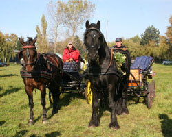 Blowatz - Herbstzeit ist Jagdzeit. Das gilt auch für Reiter und Fahrer. In Blowatz haben Herbstjagden zu Pferd eine lange Tradition. Diese wird auch unter neuer Vereinsführung durchgeführt. Am 22. Oktober war Reinhard Meißner Organisator einer Neuauflage. Elf vollgestopfte Gespanne und 19 Reiter trafen sich zum "Stelldichein" um 10 Uhr auf dem Turnierplatz, der schon so viele große und kleine Events erlebt hat und zum Jagdtag 2011 eine frische Frisur erhielt. Wir durften dabei sein und saßen auf der Kutsche von Reinhard Meißner, der seinen 13-jährigen Friesen Julian angespannt hatte, und erlebten einen wunderschönen Herbsttag in Gottes herrlicher Natur.