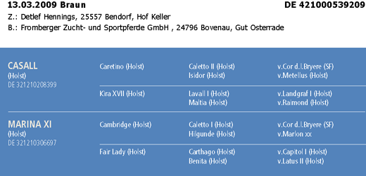 Ein rechter Halbbruder zum Springsieger ist der Reservesieger v. Cascall / Levisto / Kolibri. Cascall ist ein Sohn des Catoki, der selbst bekanntli