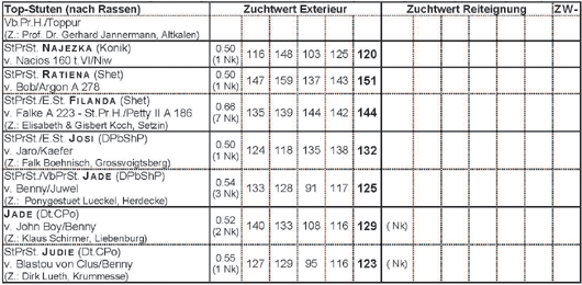 (Hafl.) v. Midas-Hanja/Almwind und StPrSt. RATIENA (Shet) v. Bob/Argon A 278 (jeweils 151 Pkt.) sowie StPrSt./E.St. PONCHOGIRL II B H 11/83 (Lewitz) v. Poncho B 387/Soliman B 292 Zuchtwerte über 150 Punkten ausgwiesen.
